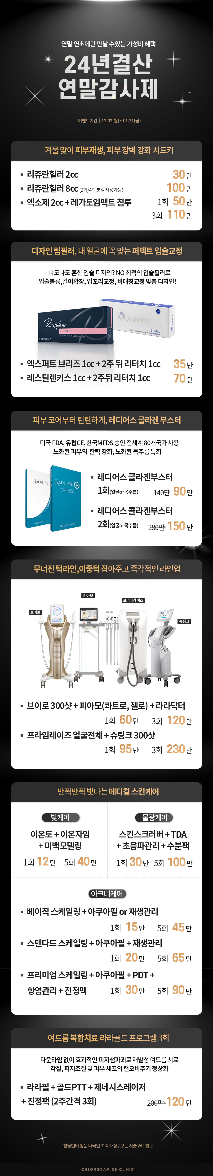 24년결산 연말감사제 2024-12-02 ~ 2025-01-31 본문 ※ 이벤트기간 : 12월02일(월) ~ 1월31일(금) ※ 의료진 지정 불가 / 청담엔비 방문 내국인 고객 대상 ※ 부가세 10% 별도, 현금·카드 동일 이전글 다음글 목록