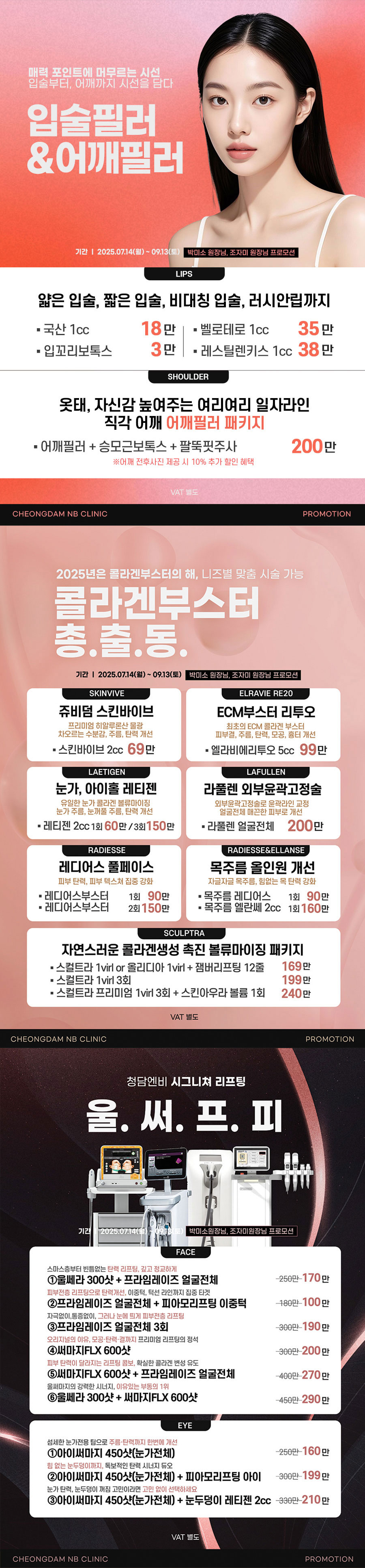 2025 트렌드 시술 총집합 2025-07-14 ~ 2025-09-13 본문 ※ 이벤트기간 : 7월14일(월) ~ 9월13일(토) ※ 청담엔비 방문 내국인 고객 대상 ※ 부가세 10% 별도, 현금·카드 동일 ㆍ본 이벤트는 박미소원장님, 조자미원장님 프로모션 입니다. ㆍ어깨필러 시술 전후사진 제공 시 10% 추가 할인 혜택 있습니다. 이전글 다음글 목록