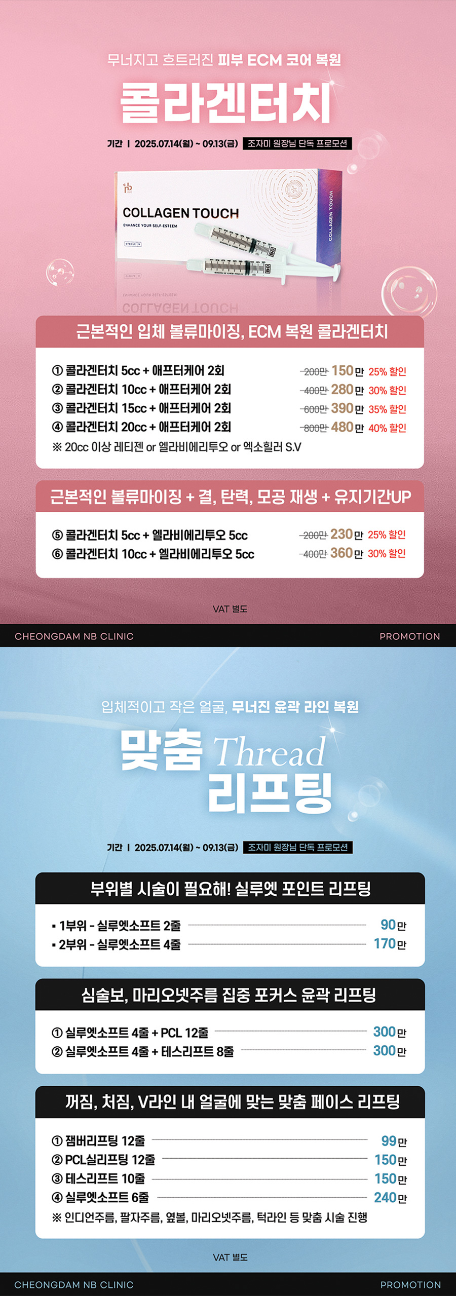 콜라겐터치, 실리프팅 프로모션 2025-07-14 ~ 2025-09-13 본문 ※ 이벤트기간 : 7월14일(월) ~ 9월13일(토) ※ 청담엔비 방문 내국인 고객 대상 ※ 부가세 10% 별도, 현금·카드 동일 ㆍ본 이벤트는 조자미원장님 단독 프로모션입니다. 이전글 다음글 목록