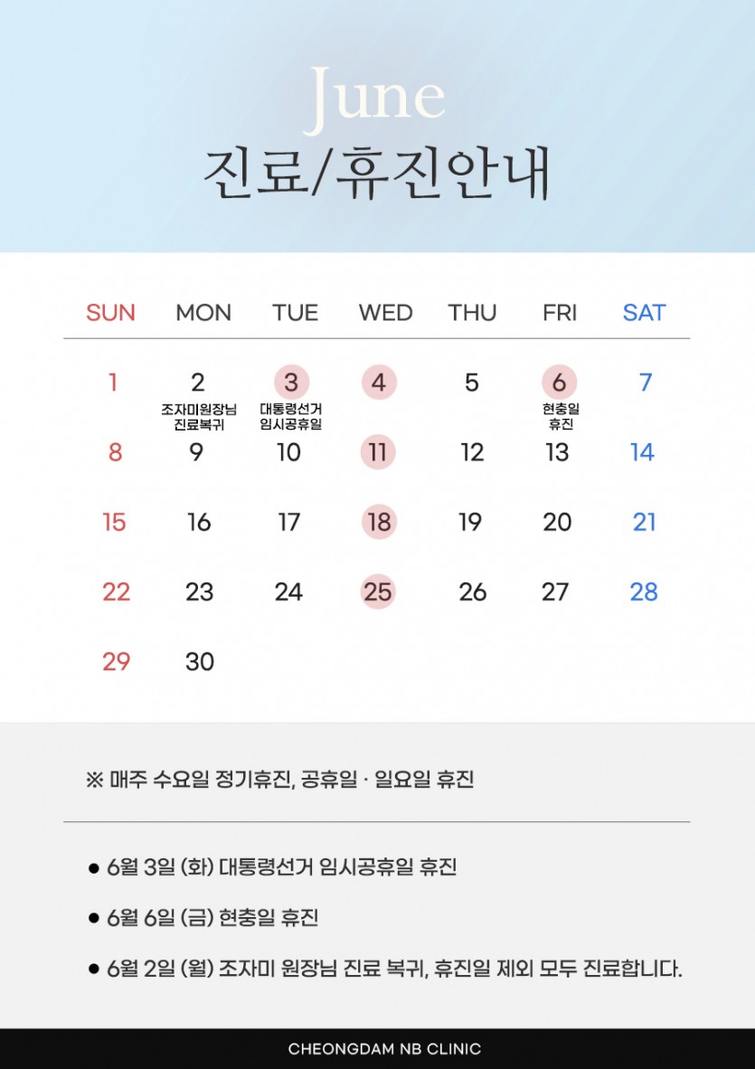 6월 진료/휴진 안내 2025-05-26 본문 ※ 6/2(화) 대통령선거 임시공휴일 휴진 ※ 6/6(금) 현충일 휴진 ▪ 조자미원장님 6/2(월) 부터 진료 복귀, 휴진일 제외 모두 진료합니다. ▪ 이황희원장님 진료일 : 매주 월, 화, 목, 금, 토 ▪ 조자미원장님 진료일 : 매주 월, 화, 목, 금, 토 ▪ 박미소원장님 진료일 : 매주 화, 목, 금 진료일정을 참고하시어 예약 및 내원에 차질 없으시길 바랍니다. 이전글 다음글 목록