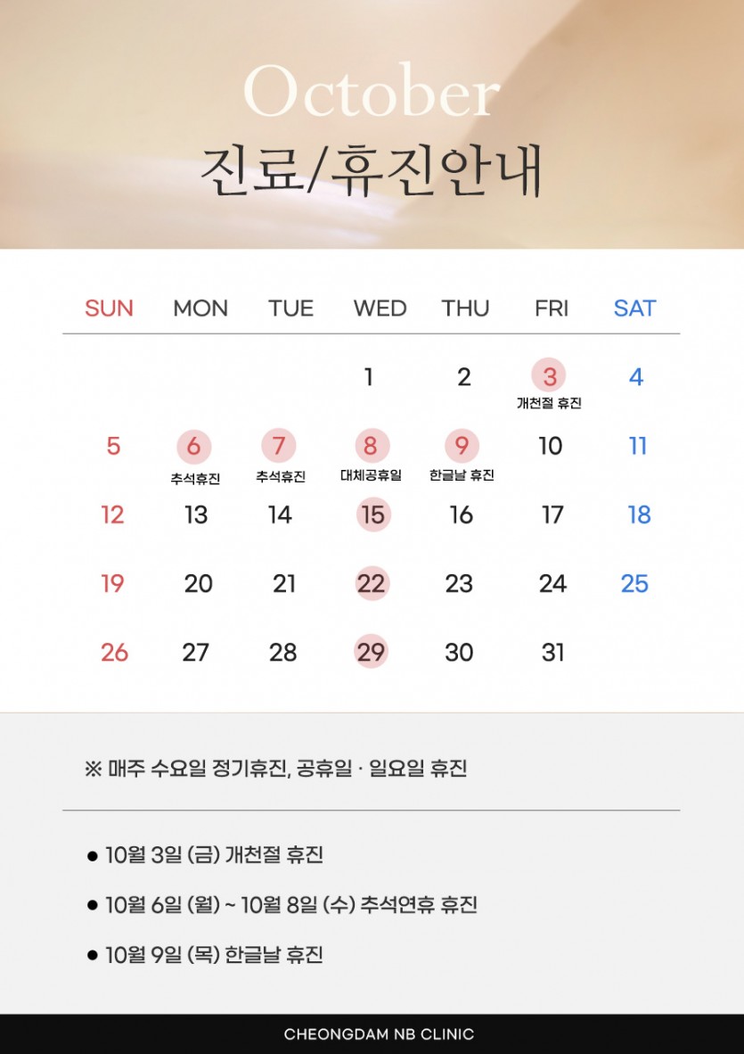 ※ 10/6(월) ~ 10/9(목) 추석연휴, 대체공휴일, 한글날 휴진